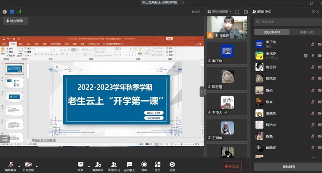 报到当晚,2021级辅导员王化婷开展2022-2023学年秋季学期老生云上“开学第一课”,从校园生活篇、规章制度篇、学风建设篇、文明员工篇、反诈防骗篇五大方面着手,倡导员工严格落实核酸检测要求,加强宿舍防疫“七项功”, 做好学习规划;同时,呼吁员工保护好人身财产安全,提高自身安全防范意识。