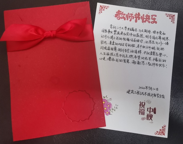 此次中秋教师双节活动主要由三个部分组成:第一部分由建艺系员工会代表建艺系全体同学用书写贺卡的形式向建艺系全体老师表达我们最诚挚的祝福与感谢,并在2周线下课开始的第1天,由系员工会主席团同学收齐祝福贺卡分送到老师的手中;第二部分是由建艺系同学们以绘制电子海报的形式来表达自己对二十大的憧憬,对中秋月圆人团圆的美好愿望;第三部分是由同学们录制节日视频,表达建艺学子对家乡的思念和对祖国早日统一的美好愿望。在表达祝福的同时,同学们联系党的二十大愿景,感恩老师们在人生旅途中对他们的助力,力争为党和国家事业擘画更加宏伟的蓝图。