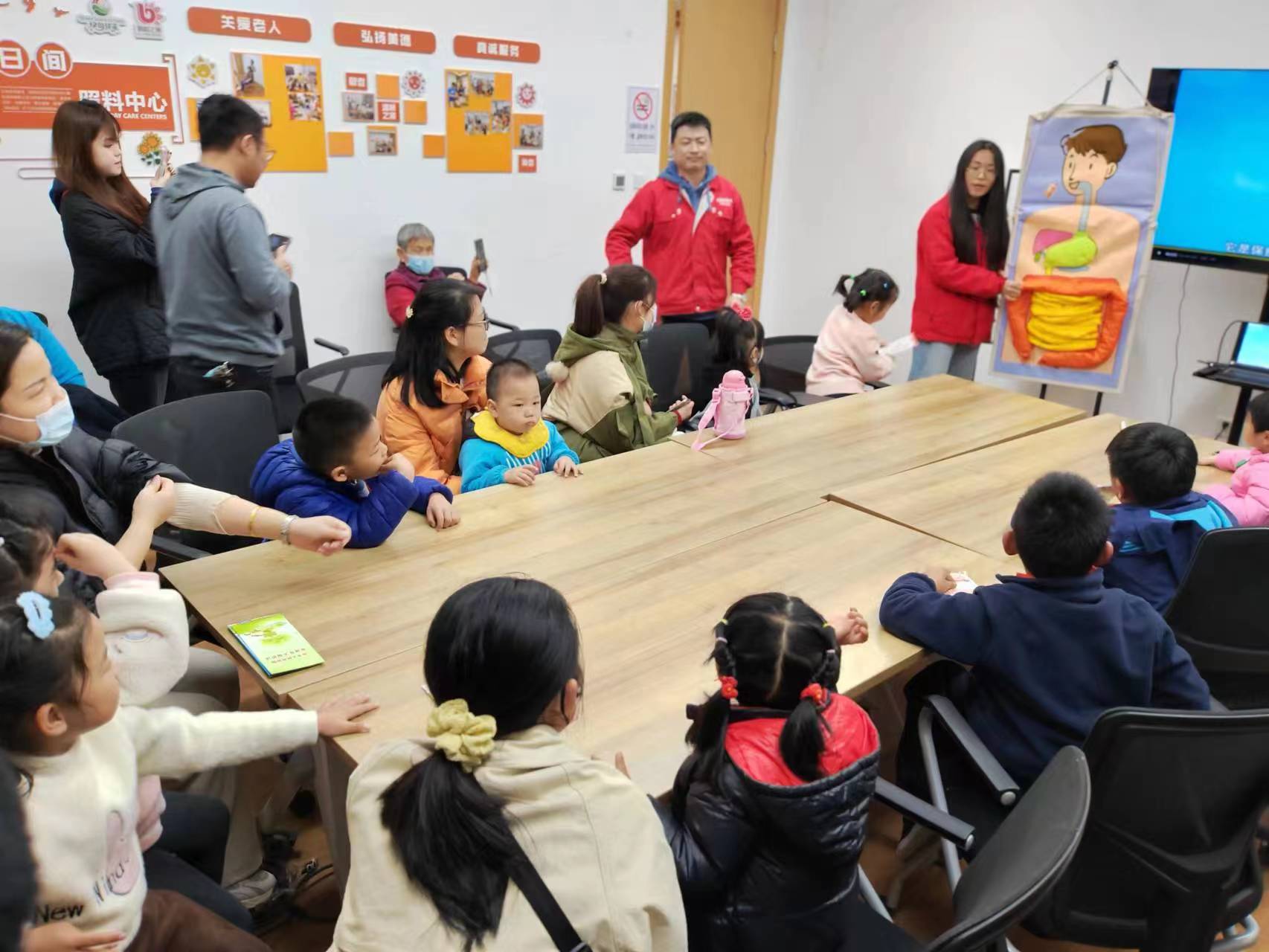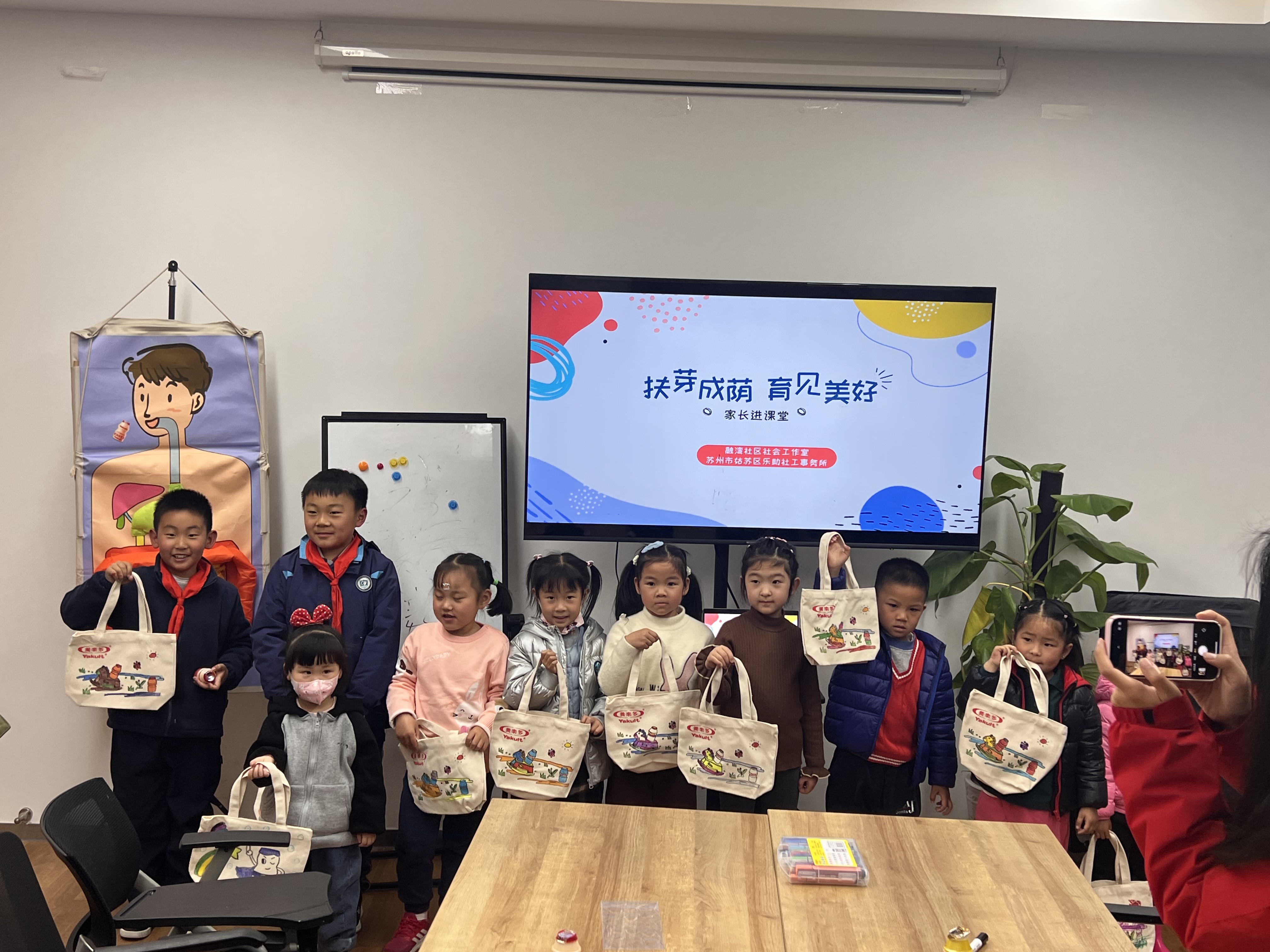 他们到达社区后,在党群服务中心工作人员指引下,先帮忙签到,填写信息,维持秩序。然后,2位志愿者与社区工作者一起,以动画的形式开启儿童健康教育趣味课堂学习,带领小朋友们学习胃部知识,通过标本直观看到人体内部的消化系统结构,明白食物的消化过程,认识各器官的功能作用及健康粑粑的形状。为充分引起小朋友兴趣,他们用小礼物作奖品,活跃课堂气氛,巩固所学知识,强化不能挑食的健康意识。最后,青年志愿者指导小朋友手绘多彩帆布包,小朋友们的奇思幻想充满惊喜,亲子互动的美好瞬间让人感动。
